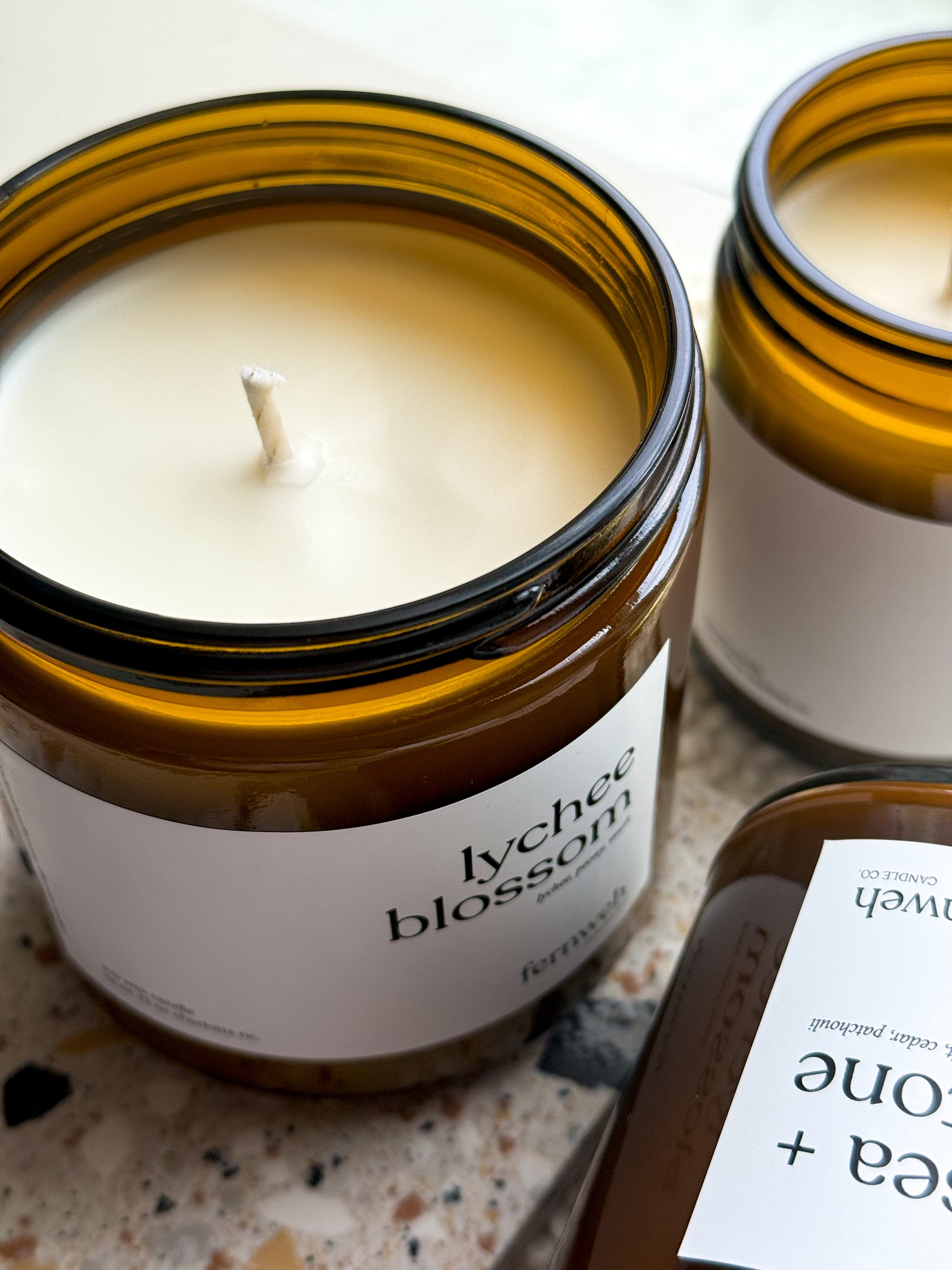 recyclable amber glass jar, soy wax, clean fragrances, cotton paper wick